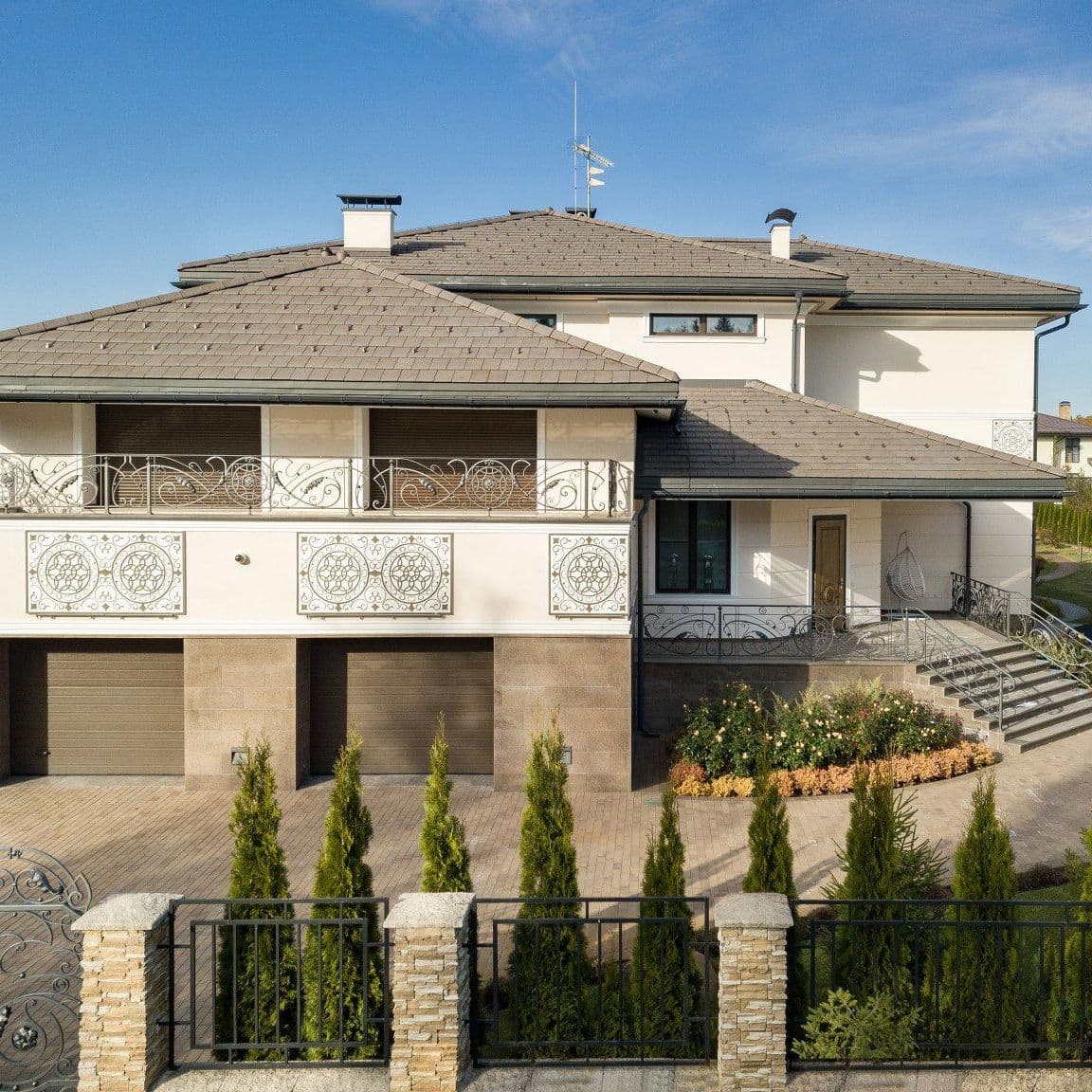 Внешний вид здания должен был соответствовать общему стилю элитного поселка, при этом отличаться от других построек. Индивидуальный образ дома передается через неординарное решение многоярусной крыши, простой фасад с изящным декором, разработку освещения фасада как декоративного элемента.